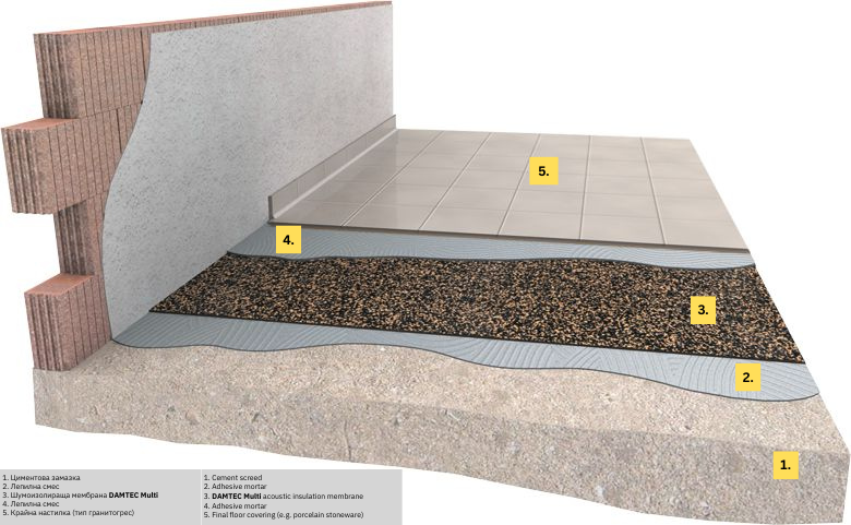 Damtec Multi acoustic membrane under ceramic floor coverings: